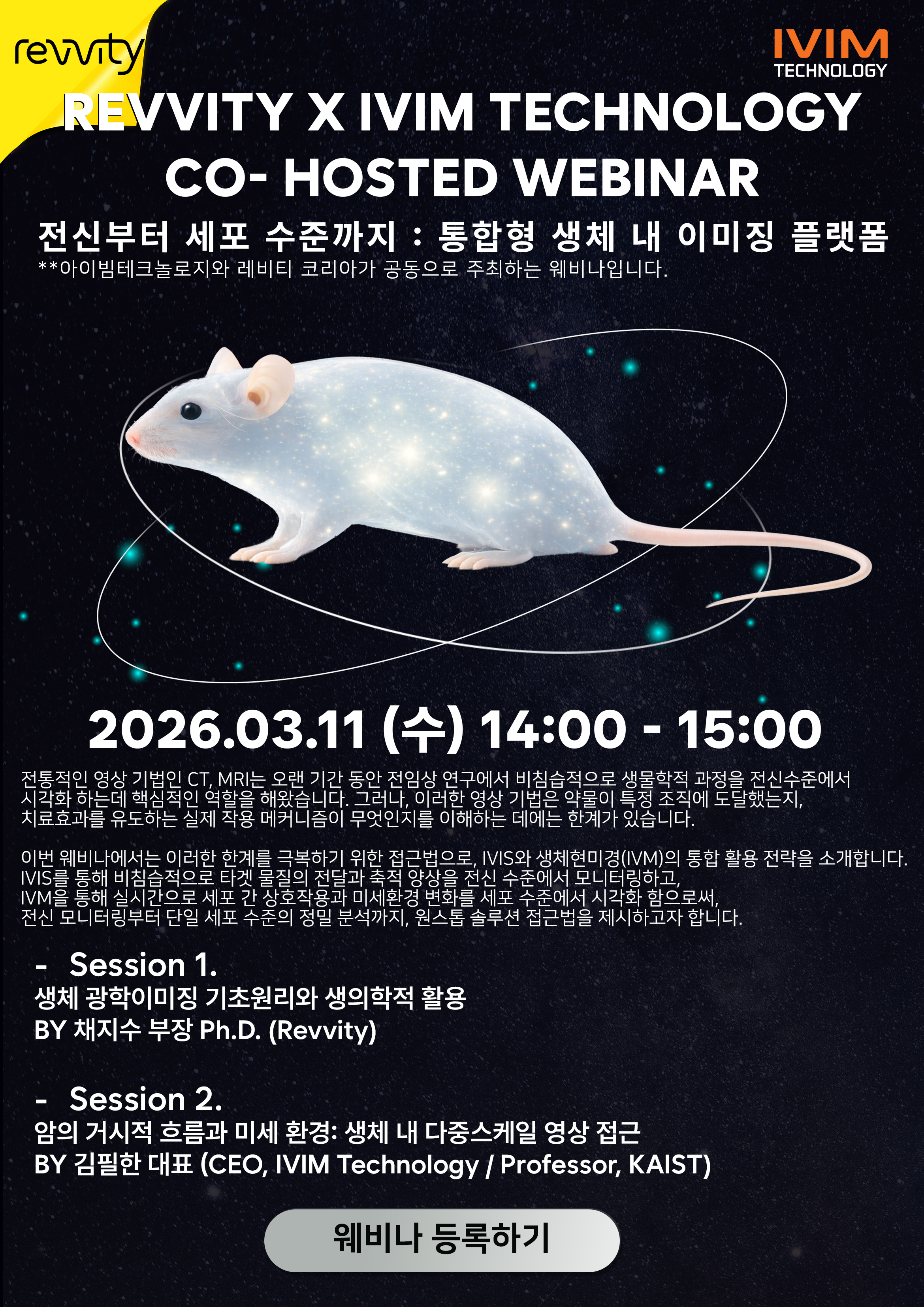 전통적인 영상 기법인 CT, MRI는 오랜 기간 동안 전임상 연구에서 비침습적으로 생물학적 과정을 전신 수준에서 시각화하는 데 핵심적인 역할을 해왔습니다. 그러나, 이러한 이미징 기법은 약물이 특정 조직에 도달했는지, 치료효과를 유도하는 실제 작용 메커니즘이 무엇인지를 이해하는 데에는 한계가 있습니다. 이번 웨비나에서는 이러한 한계를 극복하기 위한 접근법으로, 전신 광학 이미징(IVIS)과 생체현미경(Intravital Microscopy, IVM)의 통합 활용 전략을 소개합니다.