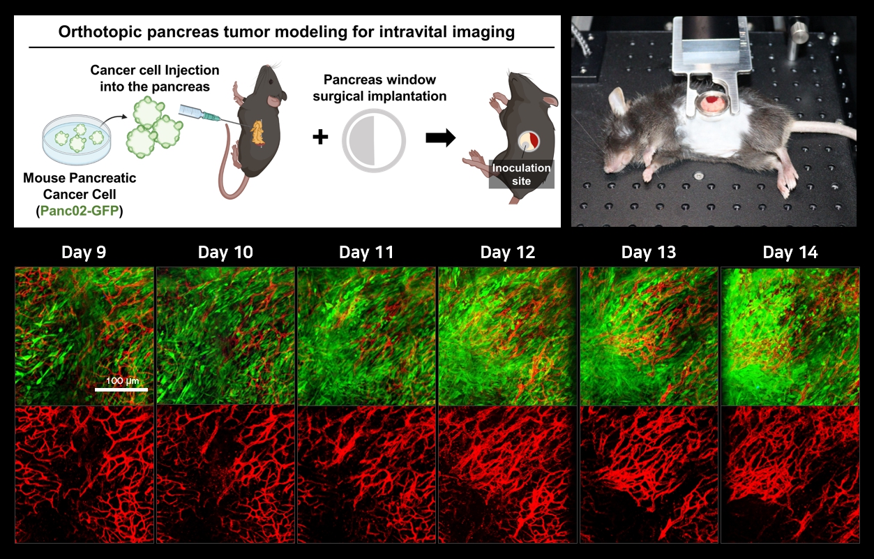 Using this window, orthotopic pancreatic tumors were repeatedly imaged from day 9 to day 14 after implantation, allowing continuous visualization of tumor growth together with angiogenic remodeling within the native pancreatic microenvironment without re-opening or re-positioning the tissue. |